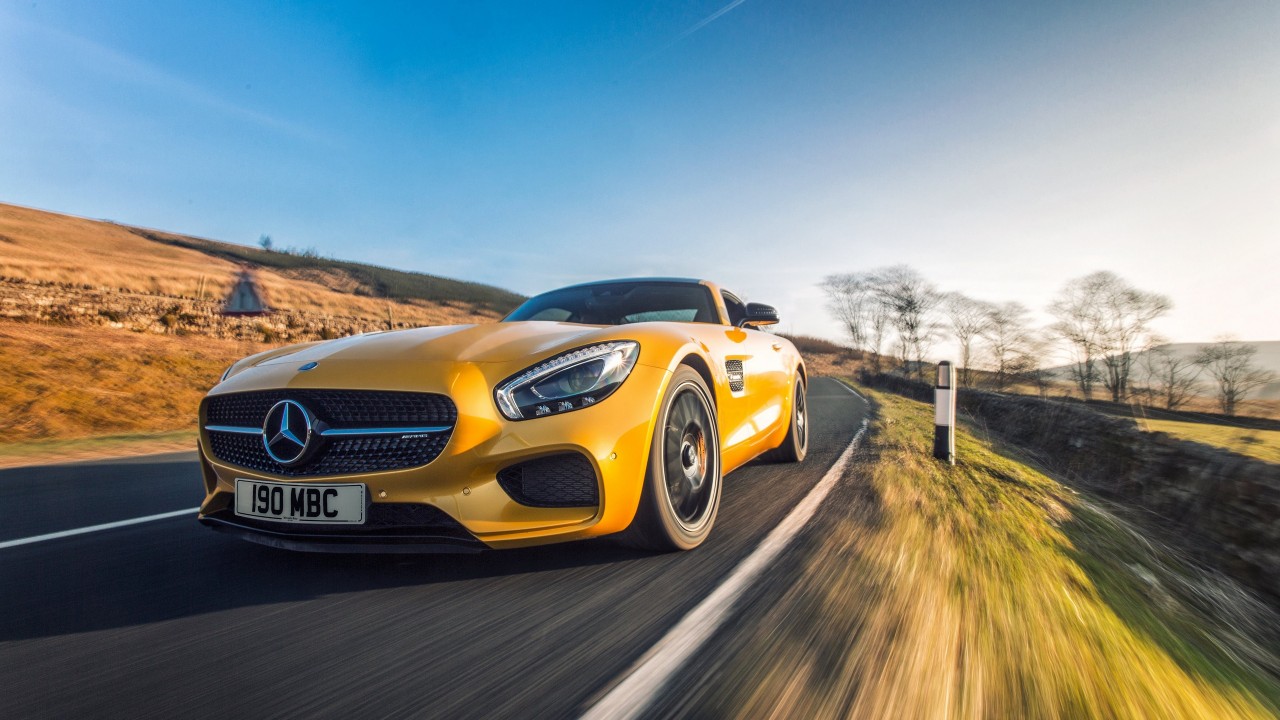 Yellow mercedes on road